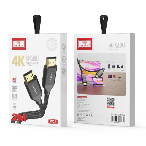 Кабел Earldom ET-W26 HDMI - HDMI, 2м., 4К, С оплетка, Черен - 18384